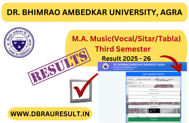 Dr. Bhimrao Ambedkar University, Agra (DBRAU) has officially released the M.A. Music(Vocal/Sitar/Tabla) Third Semester Result 2026. All students can now check their results.